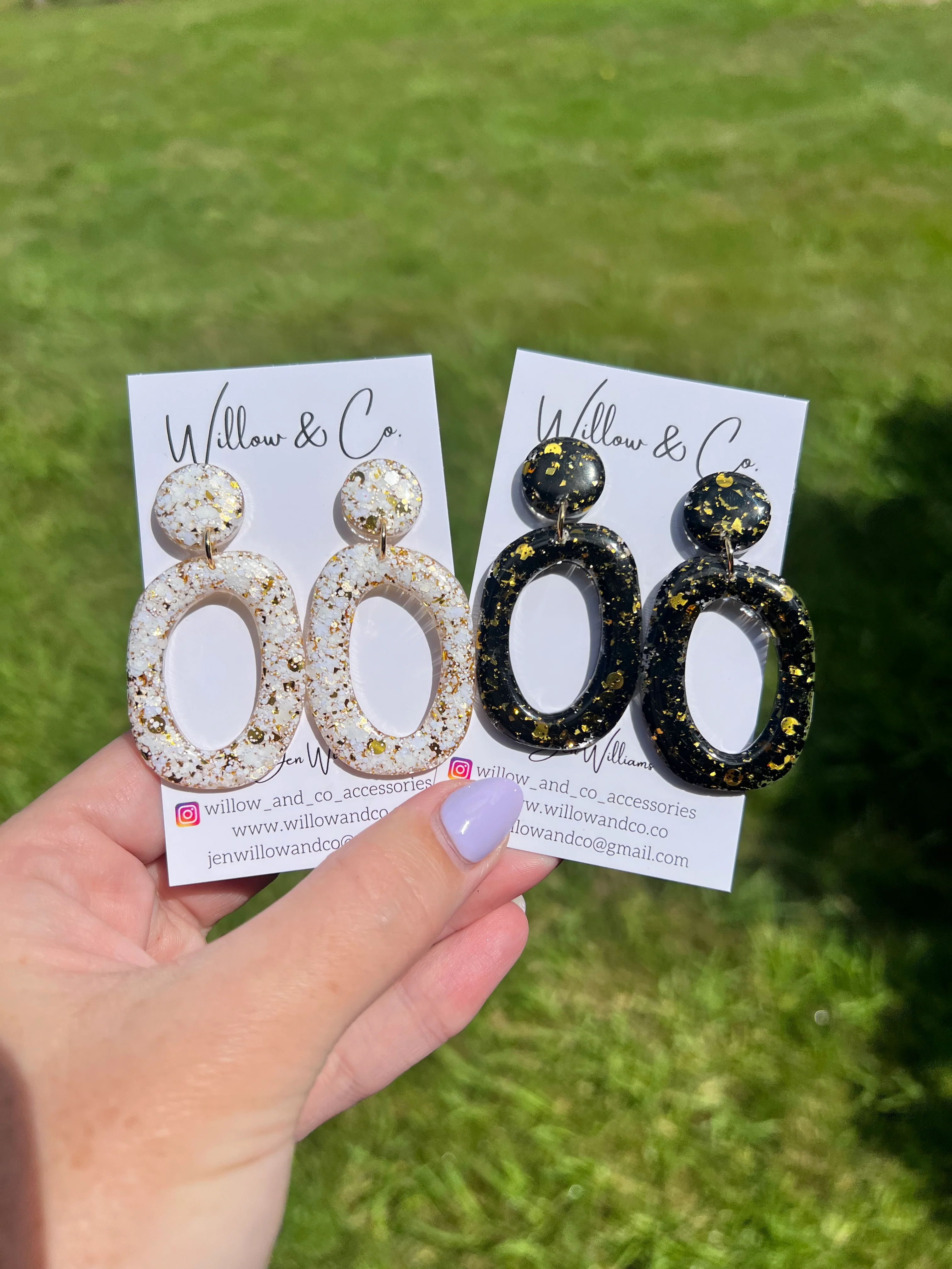 Handmade with love in Bowral, NSW, these Midnight Gold Chunky Oval Dangle Earrings bring all the drama with none of the drag. This statement silhouette is coated in moody black resin flecked with vibrant gold foil and glitter, delivering sparkle with an edge. They're the perfect combo of sculptural shape and party-ready glam.